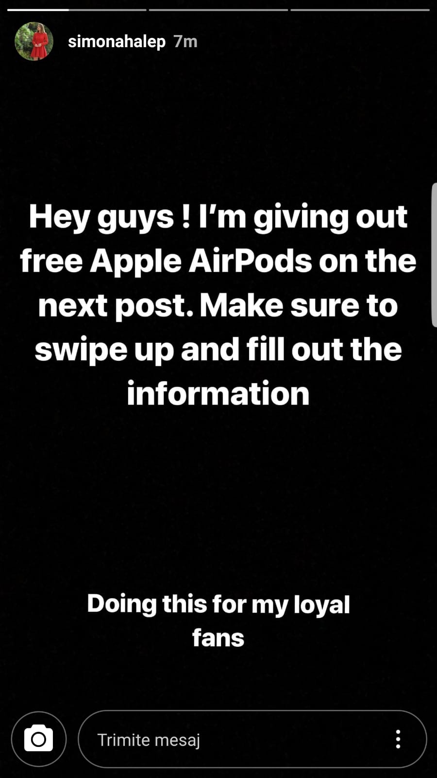 Mai întăi apare un mesaj în care spune ca oferă un set de air-pod-uri gratuite dacă vor fi urmați pașii dintr-un link share-uit la instastory.