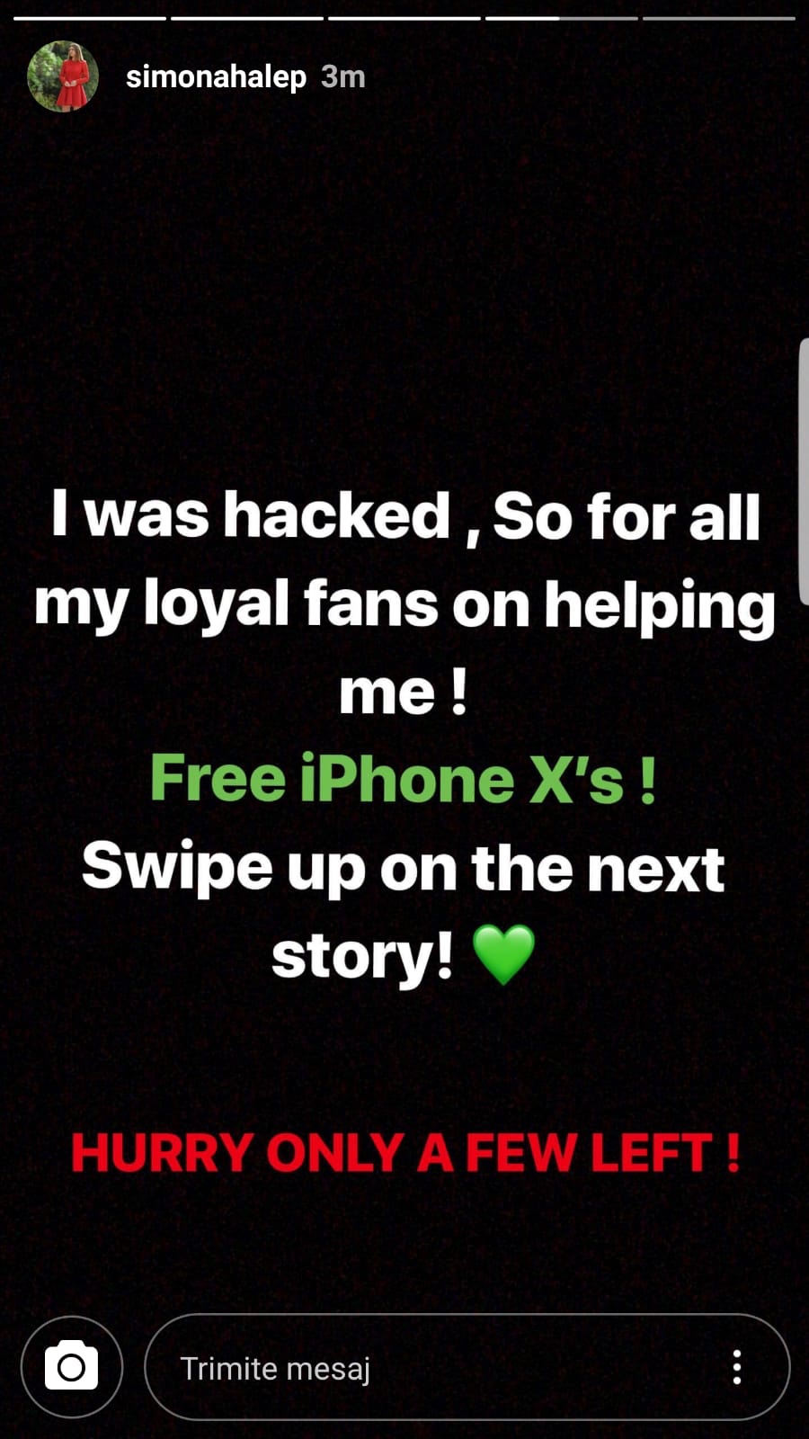 La un alt instastory spune că a fost hack-uită, iar pentru fanii ei loiali oferă un Iphone XS, daca vor fi urmați niste pași, la fel ca în cazul Air-pod-urilor.